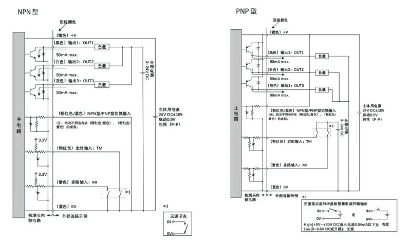 OUT1/2/3輸出:<NPN動作設定時>最大流入電流50mA,施加電壓3-24VDC(輸出-0V間),剩余電壓:2V以下(當前流入電流50mA以下)漏電流0.1mA以下;<PNP動作設定時>最大流入電流50mA,剩余電壓:2.8V以下(當前流入電流50mA以下)漏電流0.1mA以下。